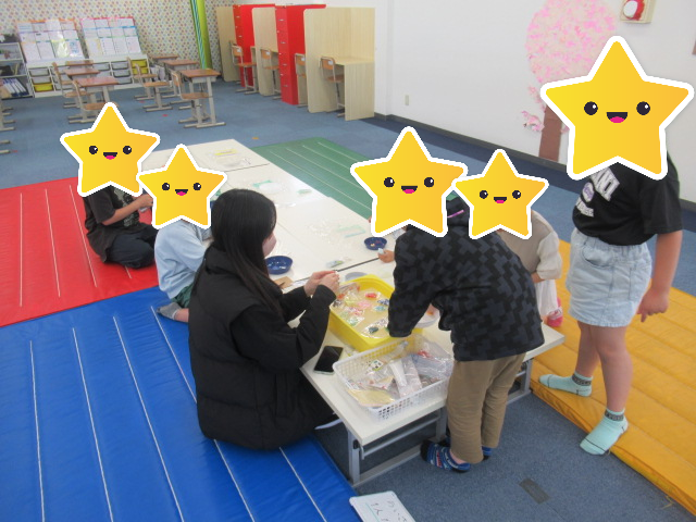 ビーズだけでも色々な色や形があって、子ども達は「イメージにぴったりなのはどれかなあ」と真剣に選んでいます(★‿★)