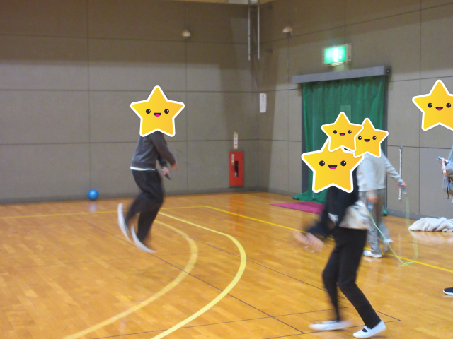 昼食をとってムービータイムでお腹を休めたら、お楽しみに向けてお腹を空かせるために8の字跳びや一斉跳びで体を動かしました。