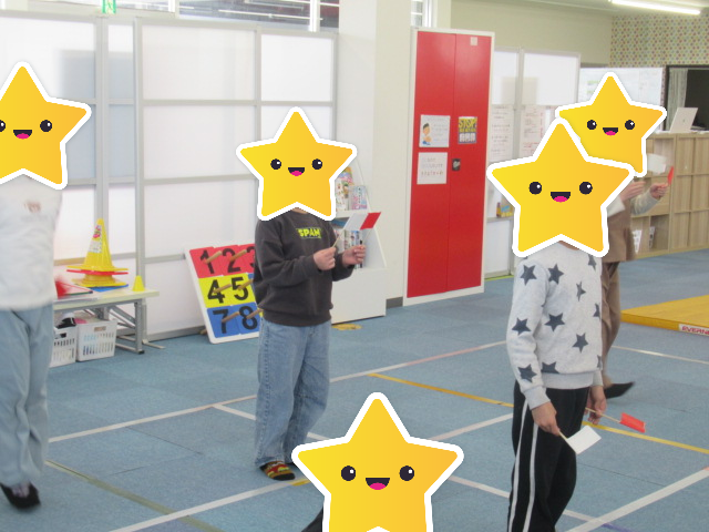 足を上げたり、手を床についたりと、頭で考えながら運動しました。お友だちやスタッフと「こうじゃない?」などと教え合いあいながら、和気あいあいとした雰囲気の中たくさん運動しました。(^O^)/