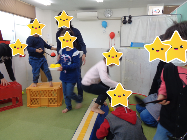 午前は、教室でサーキットをしました。お玉の上にピンポン玉やテニスボールを乗せ、平均台やコンテナ、椅子の上を歩いたよ。歩く場所とボールを落とさない、二つ同時の動きをしています。手に意識してほしく、途中でボールの重さも変えたりしました。