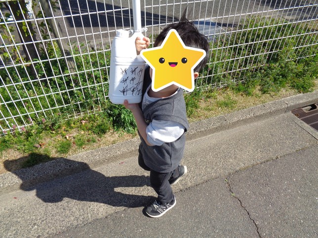午後からのお散歩は、年長さんが行きました。大きいボトルにお水を満タンに入れ重い重いボトルを持ちながら、近くにある遊び場まで歩きました。力持ちの年長さん。とってもかっこよかったぞ!!!