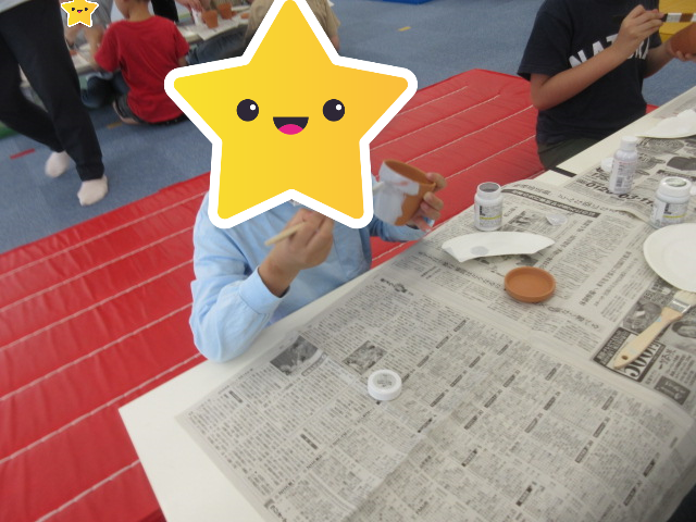まずは、絵の具を使って植木鉢に色を塗ったり、絵を描いたりしていきました。自分なりに使う色を考えながら塗っていました!