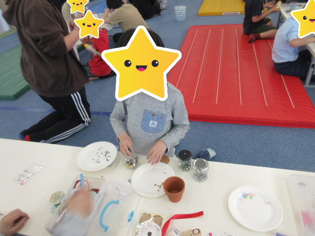 「リボン結びをして飾りたい!」「ビーズをこんな風に付けよう♪」と、黙々とオリジナルの植木鉢を作っていました。