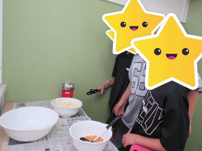 ポンポン弾けるポップコーンは鎌田の高学年のお子さんが協力的に作ってくれ、みんなで『カレー粉』『コンソメ』『マヨネーズ』『塩コショウ』等、お好みの味付けをして召し上がっていました。