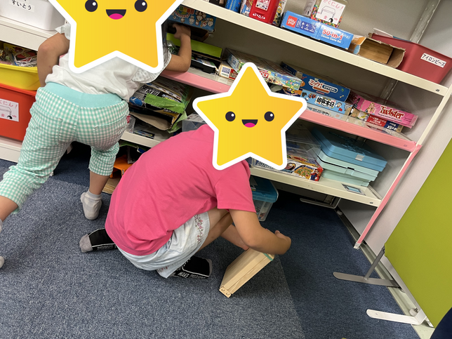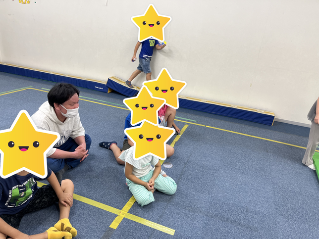 片方のチームが捜している間、隠したチームは運動スペースで座って探している様子を見学中です!
