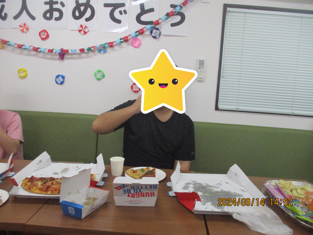 みんなで「いただきます」「成人おめでとう」とお祝いした後はピザとお菓子、ジュースに夢中になって食べていましたよ(笑)