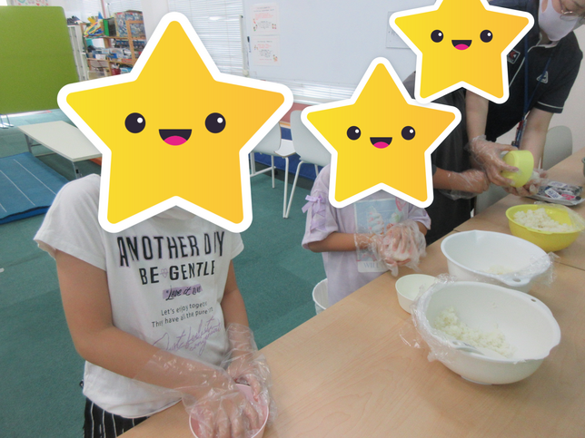 団子班は、団子粉と水を混ぜて生地作りを行いました!手袋に引っ付いて少々手こずりましたが、頑張ってこねてまとまりのある生地が完成しました。