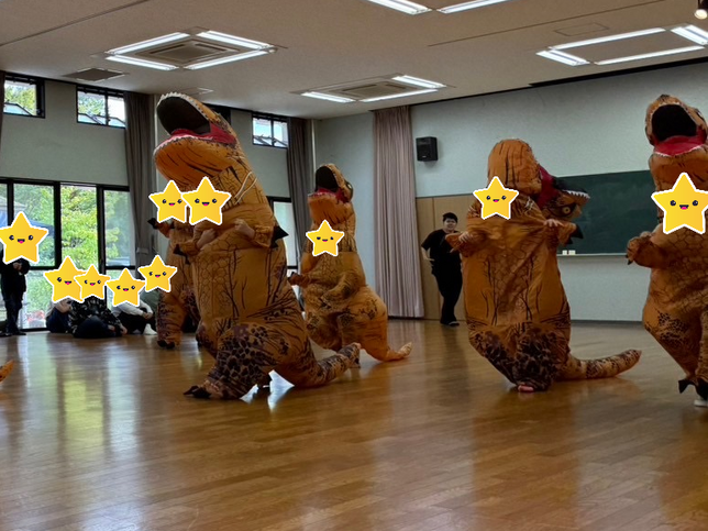 エアーで膨らませた恐竜の着ぐるみに身を包み、長くゆらゆら揺れる頭に翻弄されながらも、