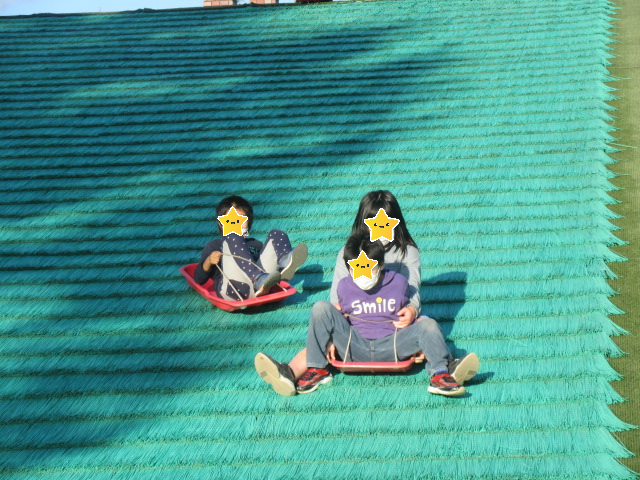 サイクリングを楽しんだ後は敷地内に併設されているソリ滑り広場に行きました。ソリは2人でも滑る事が出来るので、低学年の子と一緒に高学年の子が仲良く滑る姿も見られましたよ。ミッションクリアですね♪
