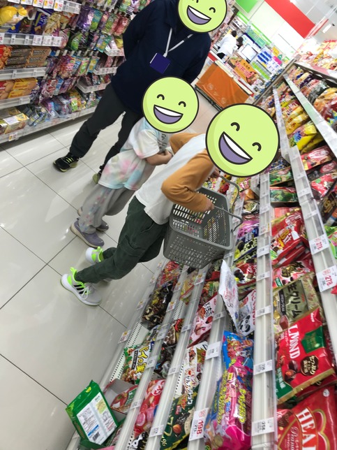 公園で遊んだあとは、郡山台新教室の近くにあるツルハドラッグにお買い物に行きました。いつもみんなが食べているおやつのお買い物です。