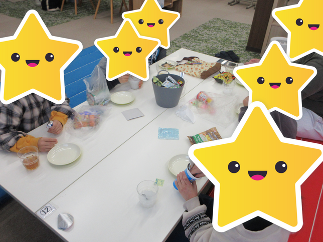 今回は、東部勤労者センターの和室を借りて、机をロの字に並べみんなで一緒に食べました。