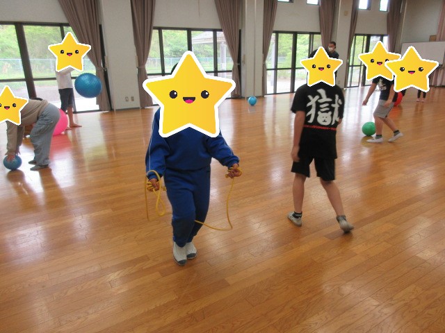 縄跳びをしたり、バランスボールの上に乗って遊んだり、