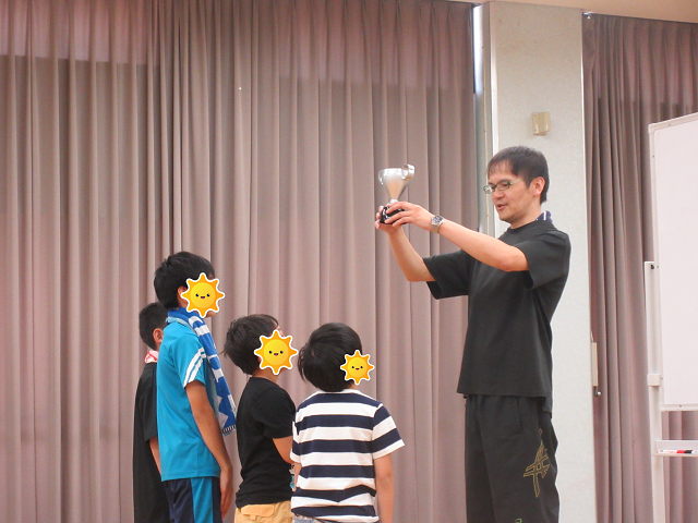 最後に勝利チームにはスタッフ手作りの金と銀のトロフィー授与です!もたったチームの子ども達は目をキラキラさせていました。惜しくも負けたチームの子どもたちもトロフィーの周りに集まっていました。