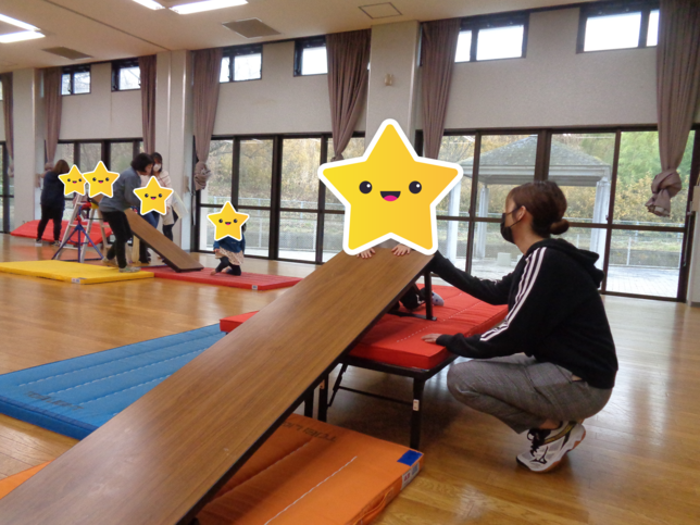 会場に入った子ども達は、様々なアトラクションに興味津々の様子ですぐに遊び始めまていました。子ども達は、小さい体を目いっぱい動かして、いつもより高い所からジャンプしてみたり、ちょっと冒険して脚立を登ってみたり、普段できない体の動きたくさん経験することができました。