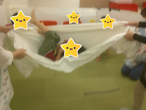 シーツを2人のスタッフが持ち、ブランコのようにゆらゆらします。