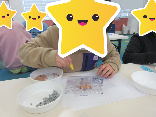 プラ板、アイロンビーズともに、細かい作業にチャレンジする子ども達の姿を見て成長を感じました。困っているお友達がいたら、「お手伝いするよ」、「ここはこの色が良いと思うよ」など、優しい言葉をかけみんなで協力し合いながら楽しく製作ができました。