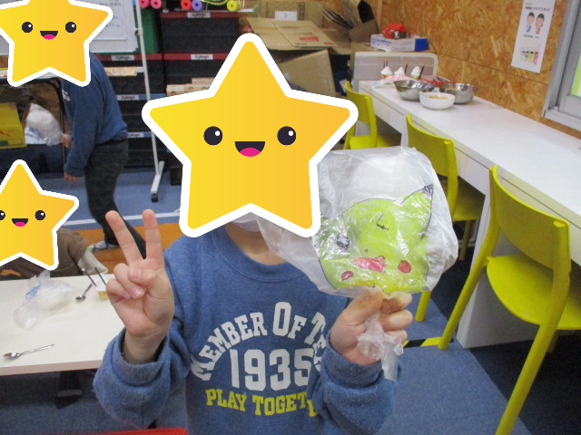 面白い顔を描くお友達や大好きなキャラクターを描くお友達、キラキラ模様で袋をデコレーションするお友だちもいて素敵な袋ができあがりました。(^o^)