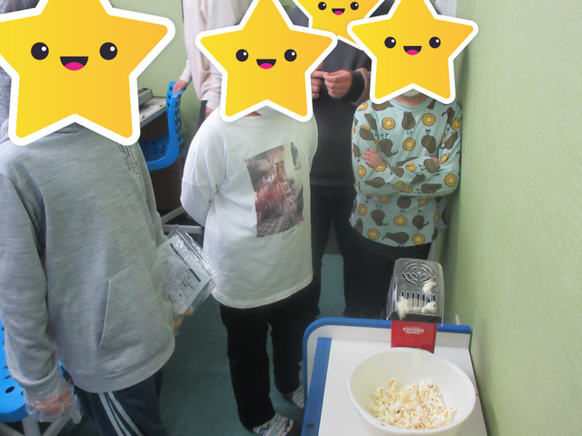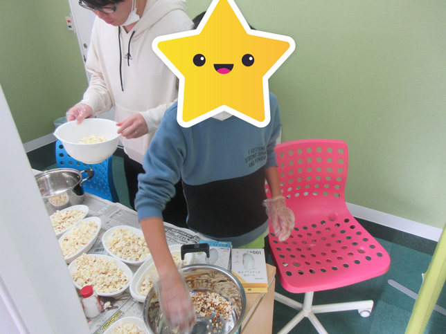 午後は映画を観る前にポップコーン作りやシャカシャカポテト作りを行いました。高学年のお友達が率先して手伝ってくれて出来上がったポップコーンなどに好きな味付けをしたら準備万端!席に座り映画が始まるのを待っていましたよ。