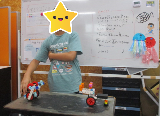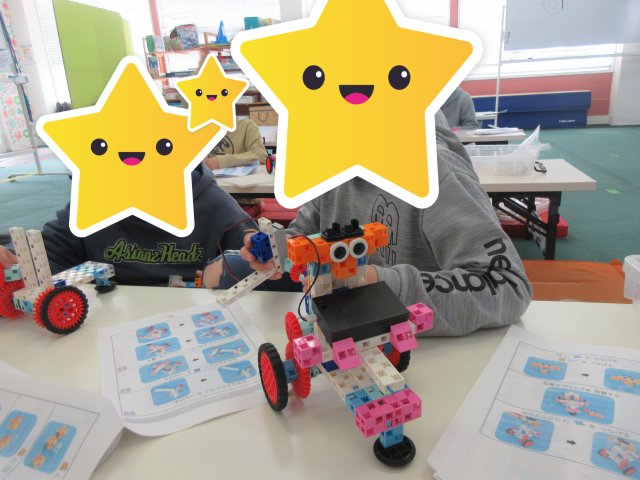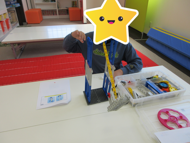 午前のステムボックス班は物を乗せることで動き出すロボット作りを行いました。自由に動くようにブロックの隙間に通して・・という難しい工程などがありましたが、スタッフに聞いたり、自分で説明書とにらめっこをして見つけ出したりと対応力が上がってきたように感じました。