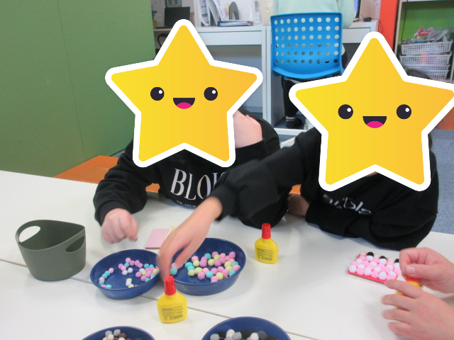 色とりどりのポンポンを使って、色をそろえたり、配置にこだわったりと、