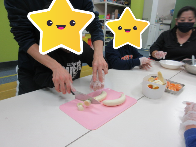 具材準備班は、バナナを一口大にカットし、