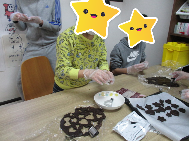 オーブンの準備ができるまでは生地を星形などの好きなマークに型抜く作業をしています。