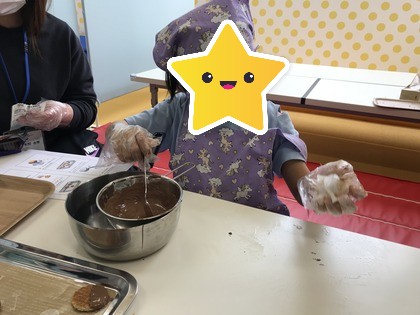 源氏パイに湯煎したチョコをかけ、デコレーションしていきます。ペンチョコやキラキラを用いて皆さん上手にデコレーションしていました(^_^)
