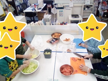 まず手洗い・消毒をしてから、手袋はめて、調理開始。