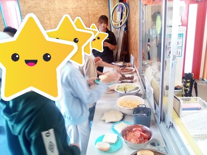 それぞれのチームに分かれて、ホットプレートで焼いたり、レンジでチンしたり、包丁で切るお手伝いもお願いしました。