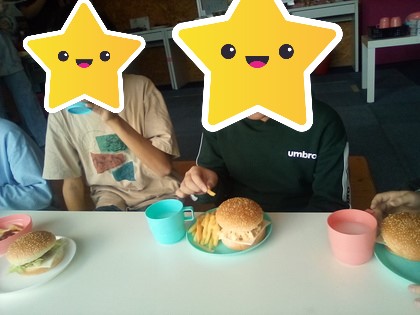 バンズ・パティ・レタス・スクランブルエッグ・フライドポテトでバーガーセットとミニホットドッグ・焼き肉サンドをみんなで作りました。