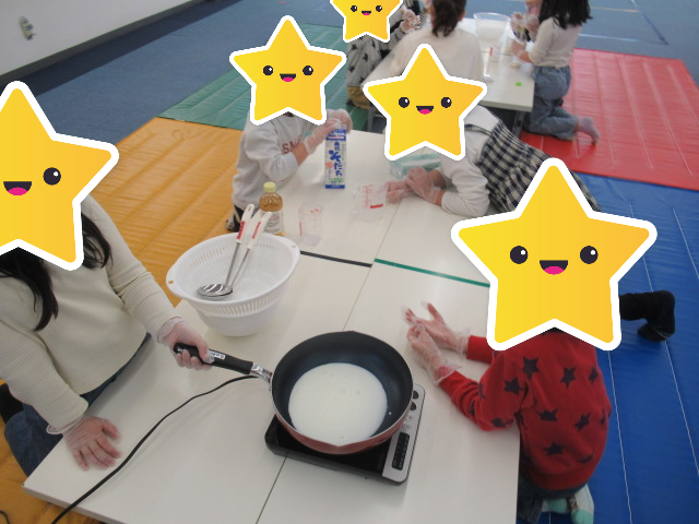 八木田教室のお楽しみ活動がクッキングだったので、実験ラボの予定を変更して一緒にホットケーキを作りました☆