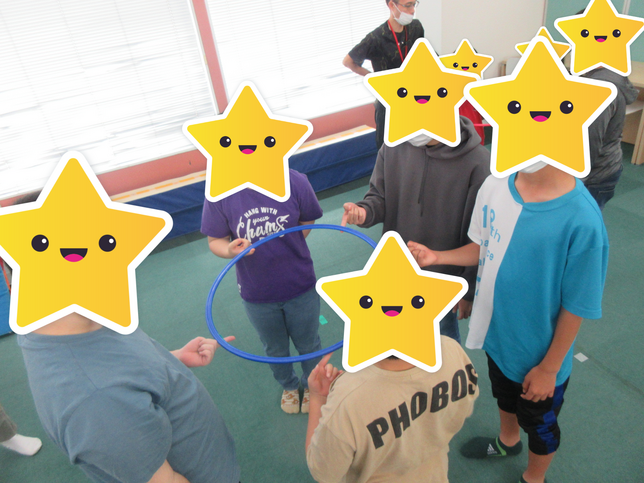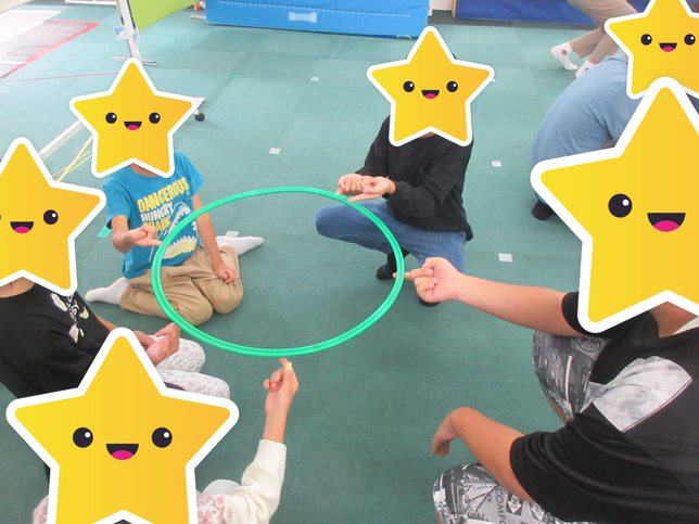 『フープダウン』はチームのお友だちと輪になって人差し指にフープを乗せ、指が離れないように下におろしていくゲームです。