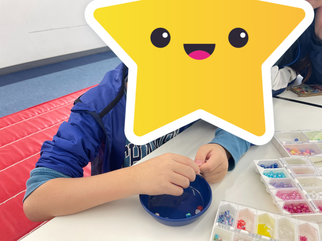 いつも使っているプラ板やビーズでは、慣れた手つきで工作を進めていく子ども達、好きな絵にアルファベットを入れたり、同じ順番でビーズを繋げたりアイデア溢れる作品が出来ていました!