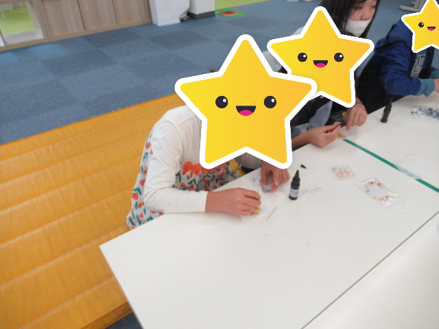 「ビーズ綺麗でかわいい!」「レジンべたべたするけど、上手にできた!」とお話してくれました(^▽^)/