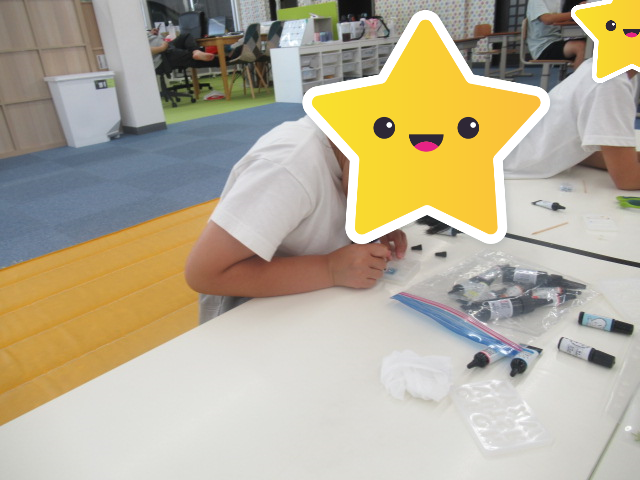 次に「レジン」作りをしていた子は、色とりどりのレジン液にラメをちりばめて「これお母さんにプレゼントしよう」と言いながら作っていました。