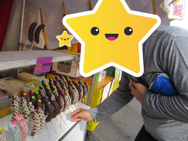 フルーツ飴やお好み焼き、クジ引きなどなど…。