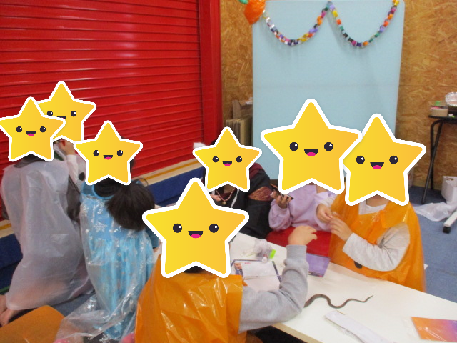 ハロウィーンパーティー当日は入室後してすぐに仮装に着替えをし、顔や手にペイントをしたりして楽しむ準備は整いましたね!(^^)