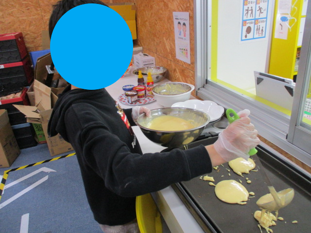 ひとり一個ずつ、卵を割ってホットケーキミックスと混ぜて生地を作ります