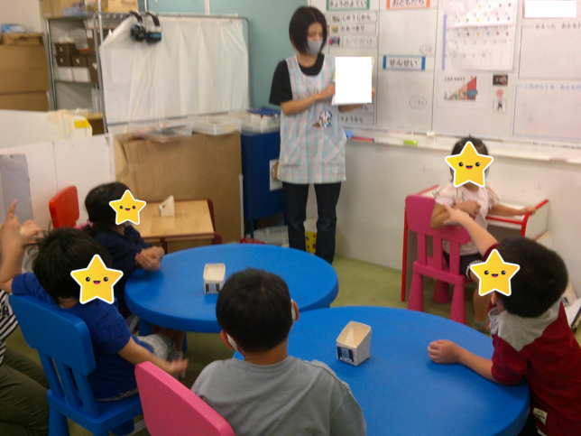 旭町教室を利用しているお子さんは3~6歳と年齢幅があり、おでかけが慣れているお子さん、おでかけが不安なお子さんなど、様々です。子ども達一人一人が見通しを持ちながら活動できるように、個別での説明と、全体での説明を行っています。