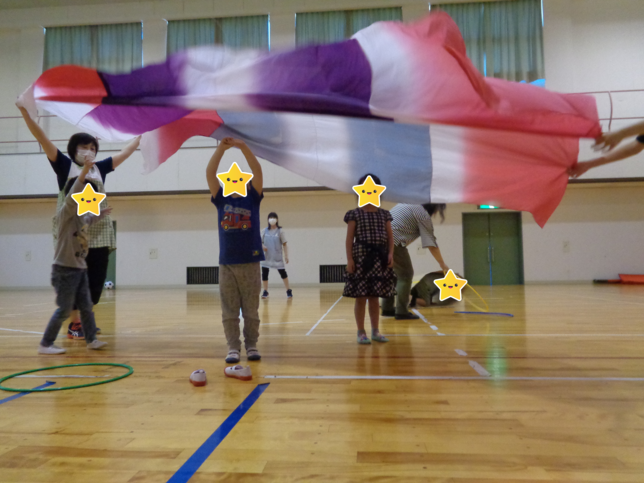 おでかけ先でなかなか遊び出せないお子さんもたくさんいらっしゃいます。そんな時は、スタッフと一緒に親しみのある遊びを楽しみます。広いスペースがある際は、風呂敷遊びにもってこいですね♪ふわふわと風呂敷が広がる様子、風が巻き上がる感覚を一気に楽しめる風呂敷遊びは、大人も子どもも楽しめる感覚遊びです!