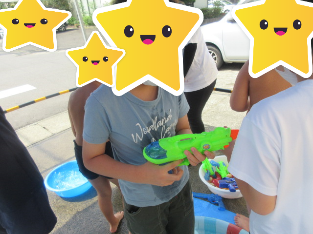 用意された水鉄砲を使って掛け合ったりスタッフからのシャワーホースを使った水掛け攻撃に笑顔いっぱいです♪