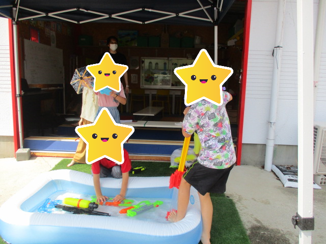水鉄砲やペットボトルを使って、スタッフやお友だちと水をかけあって楽しみました。