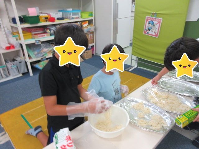 焼きそば班と豚汁班に分かれて調理開始です‼子ども達は普段からおたのしみでクッキングをしたりするので包丁も上手に使って調理する事が出来ます。