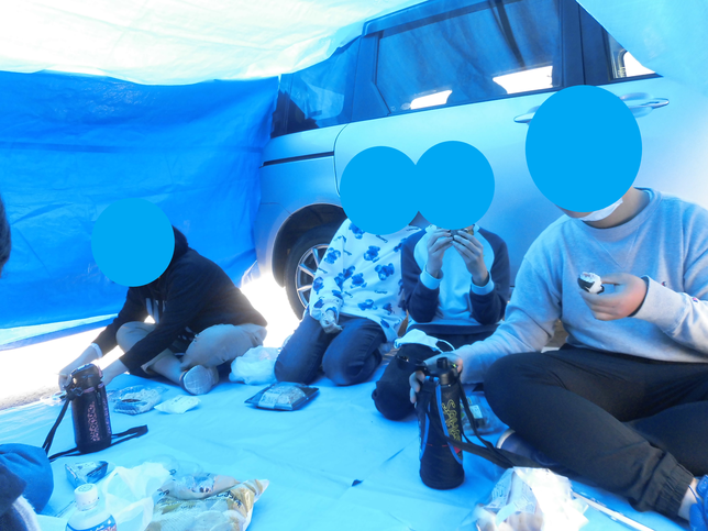 相馬へ着くと雨が降っていたため、みんなでブルーシートでテントを作ってお昼ご飯を食べました。子どもたちは、「キャンプみたい」と言って楽しんでいる様子でした。