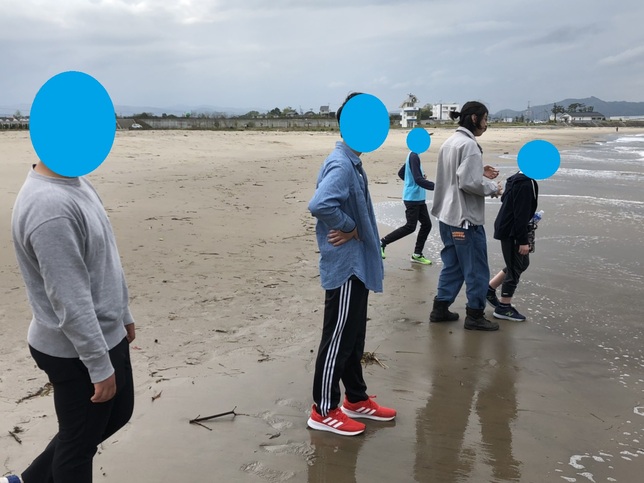 お買い物チームは、近くの道の駅へ行き、それぞれお土産や自分の食べたいものを買っていました。お買い物を終えると海へ移動しみんなで遊びました。砂浜に絵を描いたり、海を眺めたりして楽しんでいる表情が見られました。