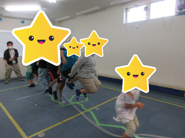 お昼を食べた後は食休みをした後、運動で長縄をしました。