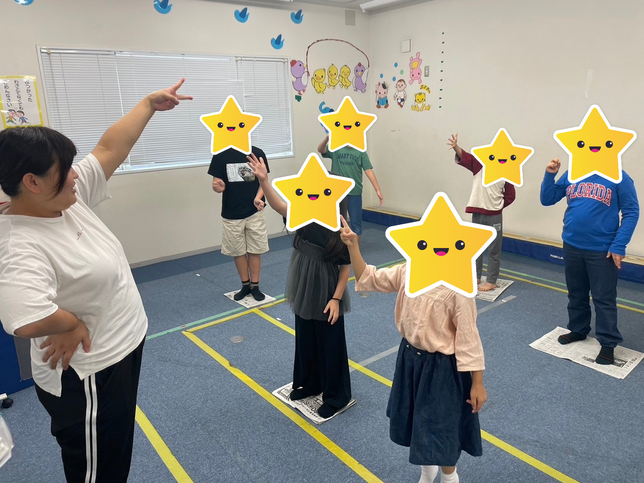 足を上げたり、手を床についたりと、頭で考えながら運動しました。お友だちやスタッフと「こうじゃない?」などと教え合いあいながら、和気あいあいとした雰囲気の中たくさん運動しました。(^O^)/