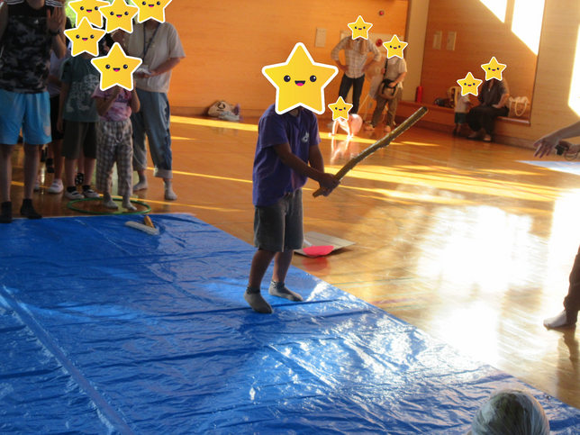順番が回ってくると、目隠しをしたままジャンプや足踏みをしてから、「もっと右だよ!」「あと5歩前に進もう!」という周りの子の声を頼りに、フラフラになりながらも進んでいます。