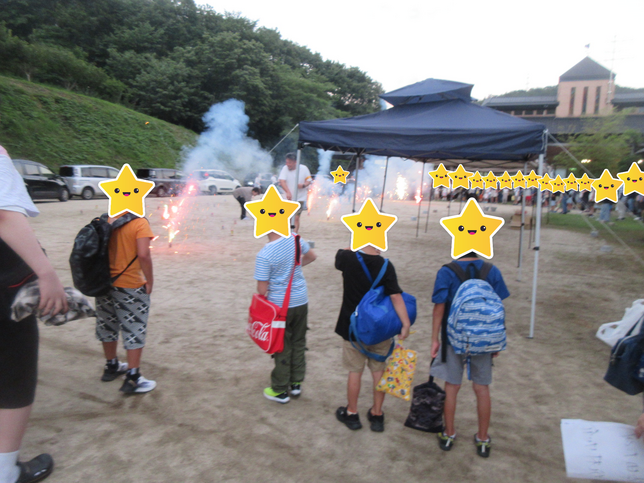 花火大会中は、他教室の子と一緒に花火をするチーム、花火のお手伝いをするチーム、カレーライスを配膳するチームに分かれて活動しています。