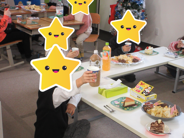 教室では、お菓子、ジュースをみんなで準備をして一緒に乾杯をしました!